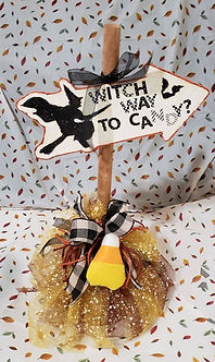 I repurposed a sign from Dollar Tree, but you could use a wooden arrow sign from DT. In retrospect, that would have been easier, but I would not have had the witch or bat graphic. I really liked the little sign, but there was just way too much glitter.